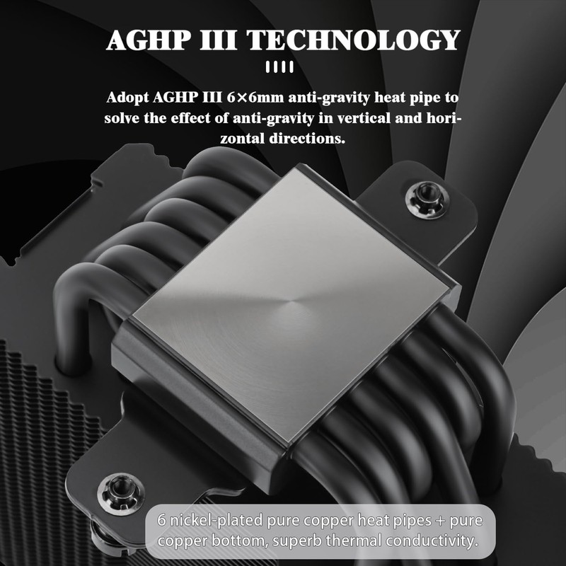 - [6 Heatpipes cooler] 6x6mm pure copper heatpipes adopt AGHP 4.0 heatpipe technology to solve the anti-gravity effect caused by vertical/horizontal direction. S-FDB bearings have up to 20,000 hours of industrial service life to ensure the long life of air cooled radiators.
