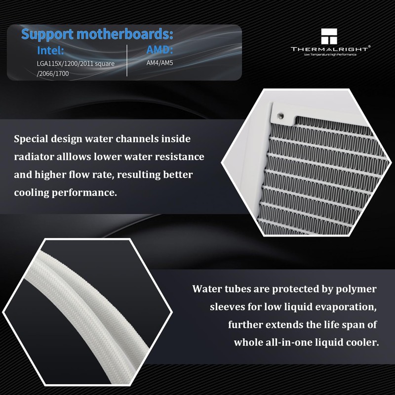 - [Better Cooling] The water cooling head with full aluminium alloy inlay process + 240 specification white aluminium fins cold plate + polymer compiled protective water pipe + standard configuration 120mm ARGB fan, creating a CPU liquid cooler with low resistance, high cooling, high value, and high lifespan.