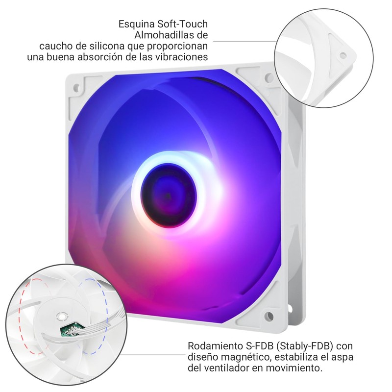 - [Amortiguación de vibraciones y ruido] El ventilador de la CPU está rodeado por almohadillas de esquina de silicona suave, que proporcionan absorción de impactos y reducción de ruido cuando el ventilador funciona a 1550 RPM, manteniendo el ventilador en un estado de bajo ruido