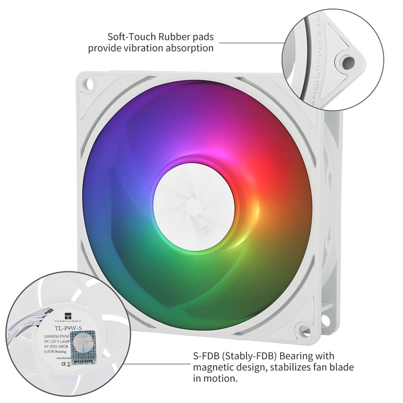Thermalright TL-P9W-S CPU Fan Computer Case ARGB Fan Quiet 4PIN PWM PC Fan, High Performance 92mm Silent Cooler Fan, 2200RPM Speed, CPU Cooling Fan(White)