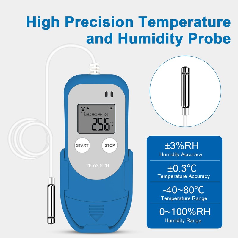 ThermElc TE-03 ETH Temperature Humidity Data Logger with External Probe, Auto PDF CSV Report, Provide Accuracy up to ±0.3°C, LED Warning Light, Multi-device Comparison
