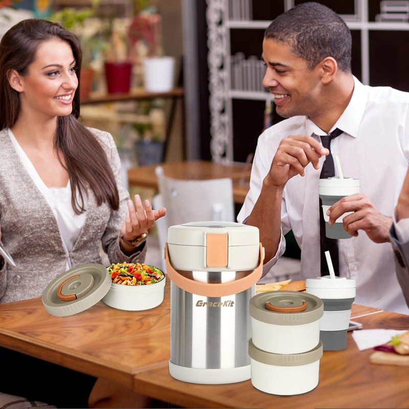 - You will get:67oz thermo for hot food Three inner containers, two stainless steel bowls, one leak-proof lid A travel collapsible cup, collapsible cutlery and carry bag, ideal for picnics, camping or eating out