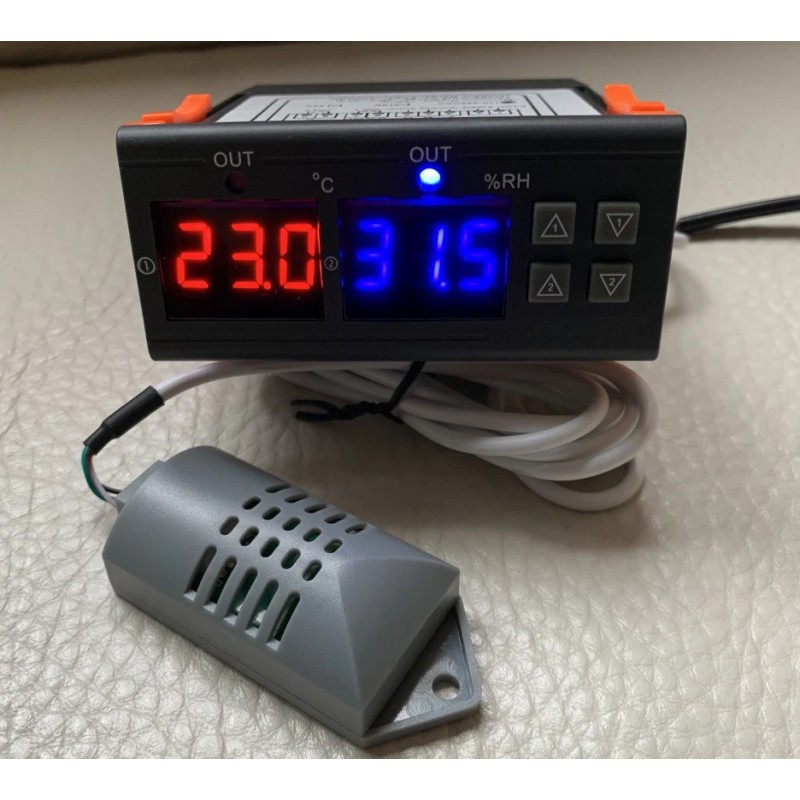 This controller serves the purpose of monitoring and controlling temperature and humidity levels. Equipped with a buzzer and flasher alarm, it alerts users when the maximum or minimum limits are exceeded, preventing potential damage. For example, if humidity rises in a basement due to a faulty dehumidifier or water leakage, the controller triggers an alarm sound. The same applies to temperature thresholds. It also has two relay outputs for controlling temperature or humidity devices.