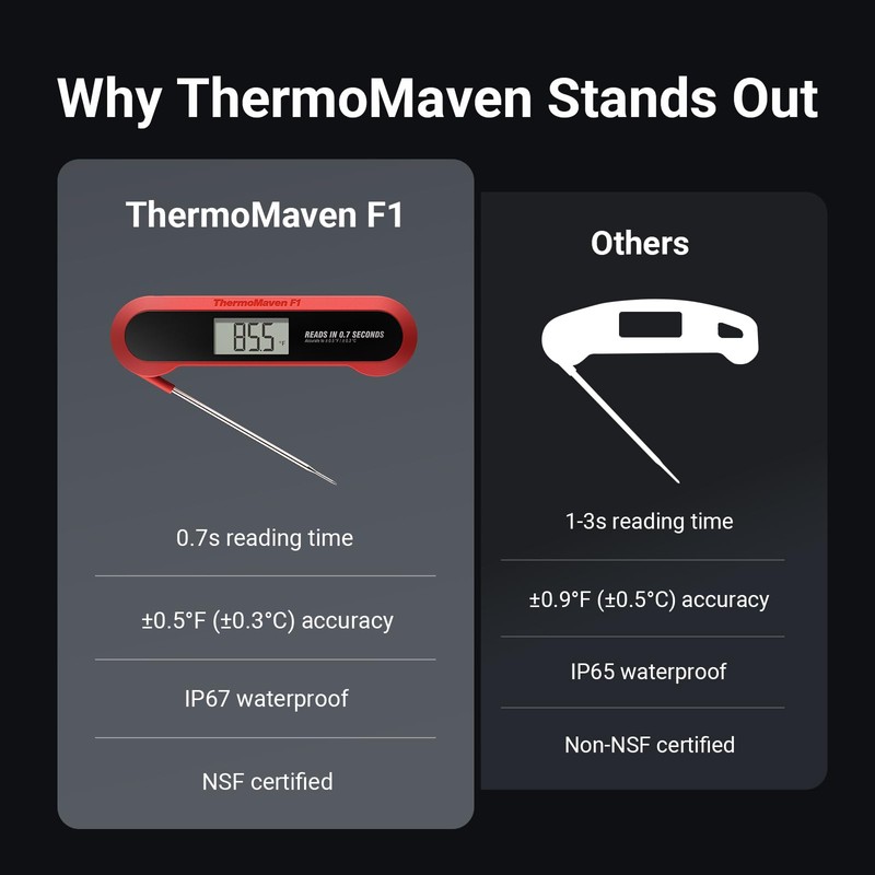 - ππ¬πππ© & ππ§ππππ¨π ππππππ£ππ¨: Get ultra-fast, accurate temperature readings in 0.5 seconds with the ThermoMaven F1 meat thermometer. NIST certified for Β±0.5Β°F (Β±0.3Β°C) accuracy. No more guessing, no more overcooking or undercooking.
