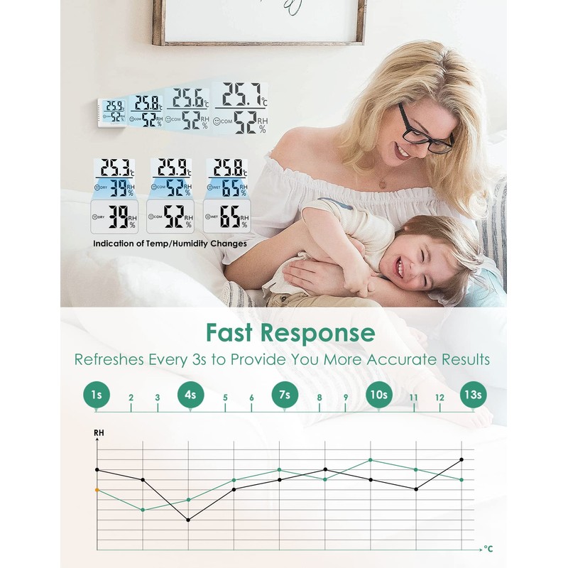 - AIR COMFORT DISPLAY: Mini thermometer hygrometer with practical comfort display and vivid visual representations that help you detect the humidity immediately. Our room thermometer and hygrometer have a high-precision sensor and 16 sensitive ventilation openings and update the readings every 3 seconds to provide you with the latest and most accurate temperature and humidity values. Temperature range -50°C to 70°C (-58°F to 158°F) and humidity range 10% to 99% RH with an accuracy of ±1°C & ±3%. RH.