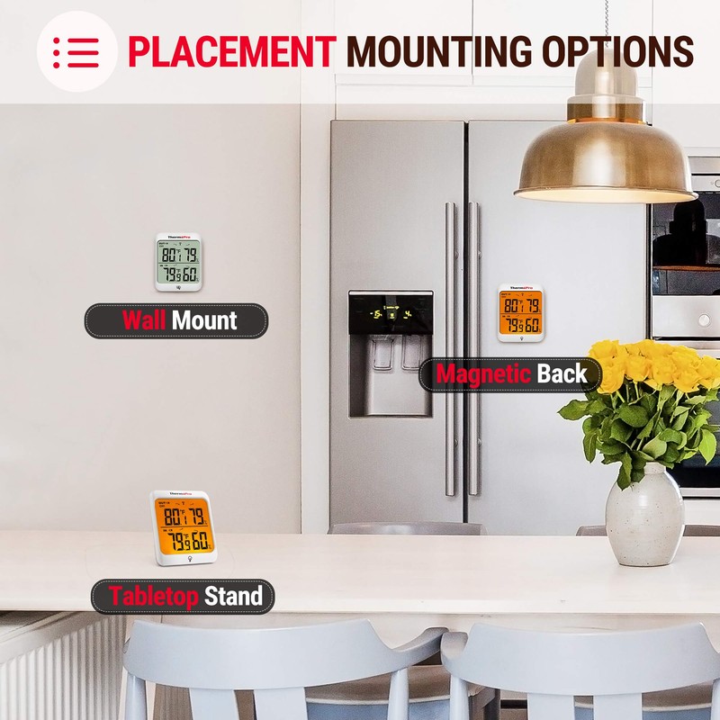- Multiple Mounting Options: Indoor/outdoor thermometer wireless features multiple placement options; Tabletop stand for various surfaces, magnetic back for different iron surfaces, and hang hole for wall-mount, convenient for you to put it anywhere