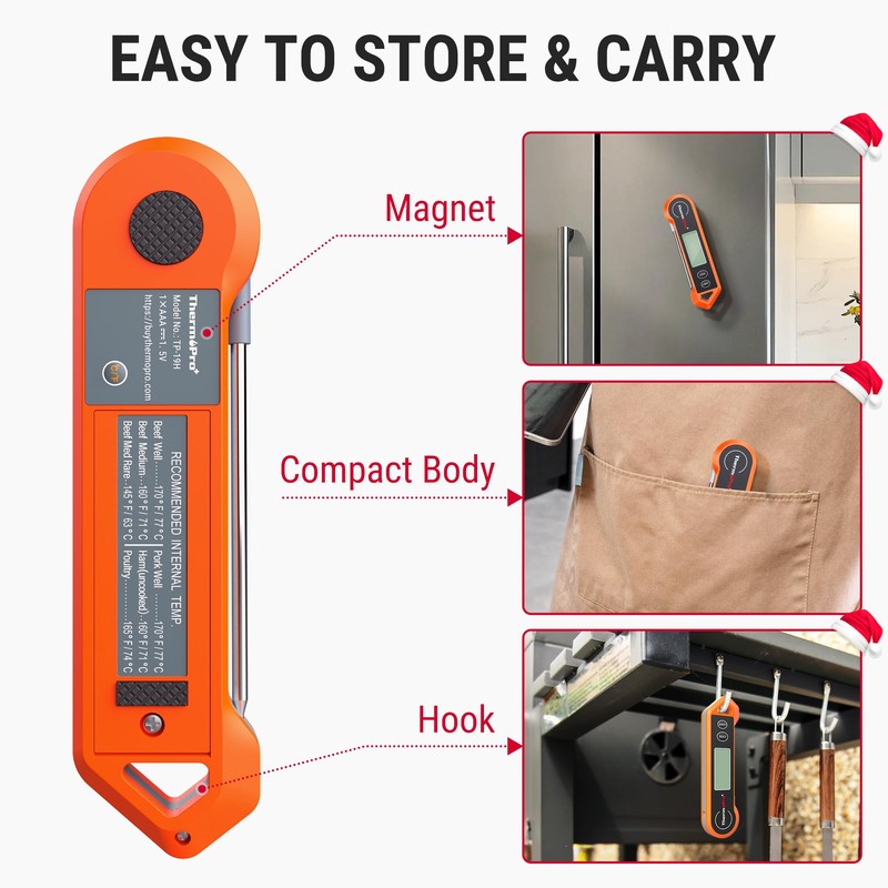 • IP65 Waterproof & Convenient Storage: Quickly clean the meat thermometers for grilling with probe under running water; features a magnetic back to allow for placement on any metal surface or use the hang hole for hooks