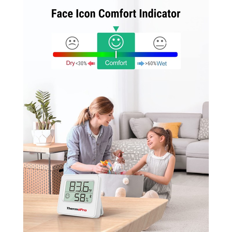 - Face icon comfort indicator: Humidity meter features face icons to indicate DRY/COMFORT/WET air condition quickly to notify you to adjust your humidifier or dehumidifier accordingly