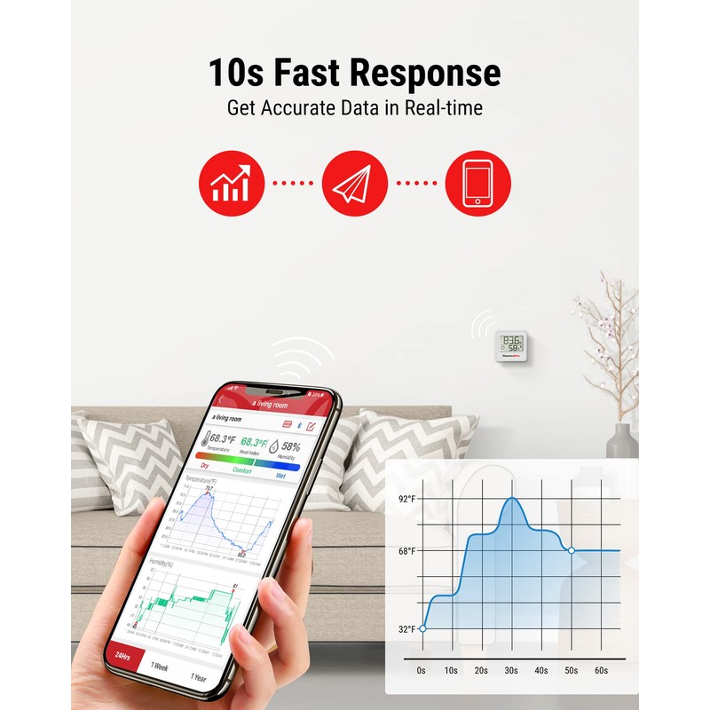 - 1 Year Data Storage with Data Graph: Home temperature monitor displays an easy to use smart thermometer graph with Maximum 1 year time period so you can analyze your home's historic temp and humidity data without registration