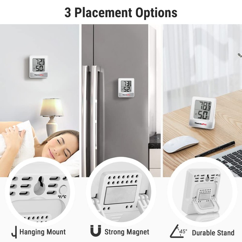 - Multiple Placement Options: This humidistat has 3 placement options - Tabletop Stand / Magnetic Back / Hanging Mount, place the wall thermometer anywhere you wish such as living room, baby room, kitchen, greenhouse, guitar room, office or cellar