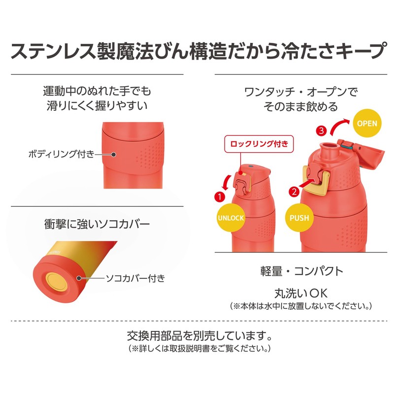 - Material: Inner bottle: Stainless steel; Body: Stainless steel (acrylic resin coating); Lid/Cap body: Polypropylene; Lid gasket/Seal gasket/Soco cover: Silicone rubber