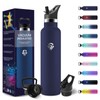 - 2 interchangeable leak-proof bottle lids: (1) The Flip Straw sports cap effortlessly delivers a high flow that allows you to drink stainless steel from your water bottle without removing the cap. (2) Handle Lid: This clasp comes with a carrying ring and a filter. It can block the tea leaves, fruits and ice cubes or something else when drinking.
