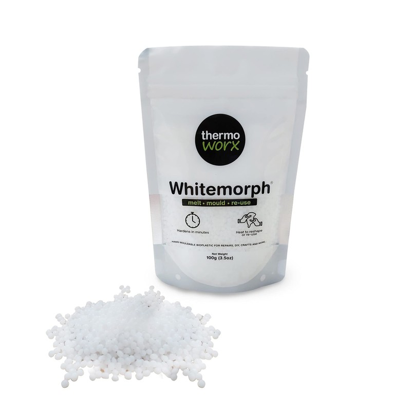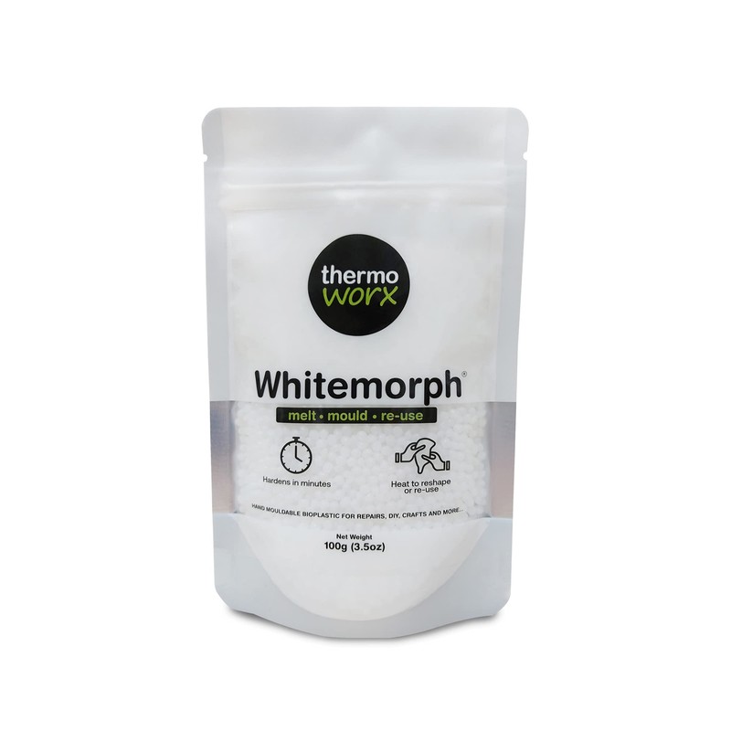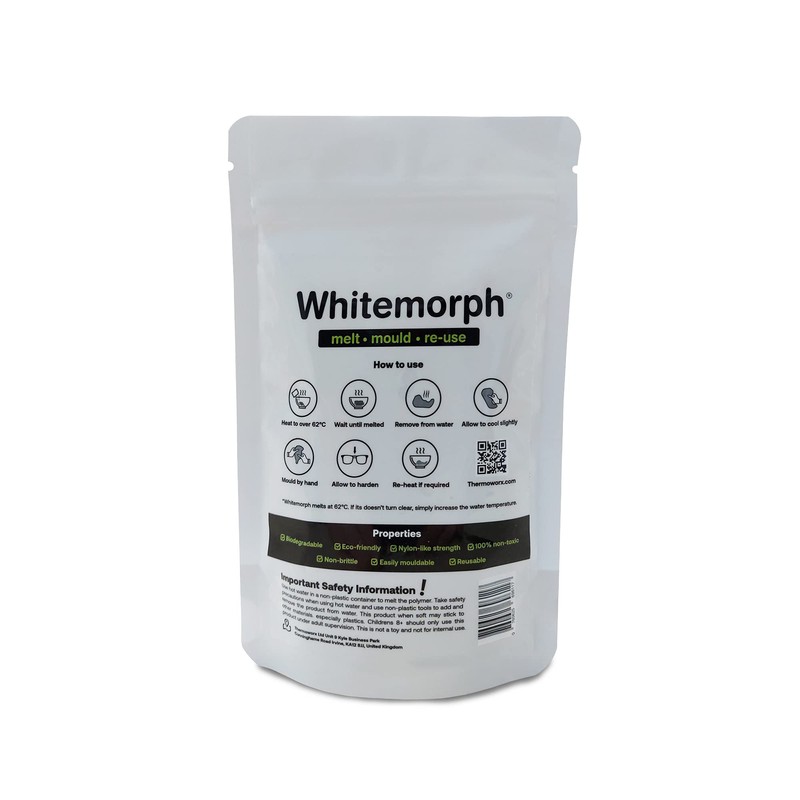 Whitemorph is a reusable thermoplastic polymer with a low melting point, ideal for repairs, DIY, crafts and more... The pellets fuse together, soften and turn transparent when heated to over 62°C allowing users to easily shape the polymer by hand. Whitemorph hardens to a solid, white, non-brittle, strong material that truly has unlimited possibilities. Heat the material back up to reshape and reuse. Whitemorph has no shelf-life and is fully biodegradable. This pack contains 100g (3.5oz) of material in a secure, handy resealable pouch. Thermoworx have been specialist suppliers in hand mouldable bioplastic for over 10 years. We only provide the best quality materials and work alongside manufacturers to ensure you are buying the safest, strongest, highest quality materials on the market.