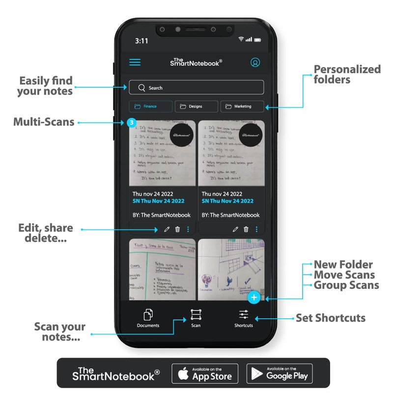 - VERSATILE: thanks to TheSmartNotebook app (iOS/Android), included with this smart notebook, you can digitise your notes in three simple steps: 1) write, 2) scan and 3) capture. You can also edit, convert to text, save, organise and search for information more easily. All this will help you organise your work, travel or any important task you are going to do and have it always available with you.