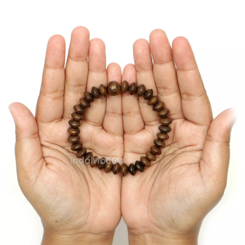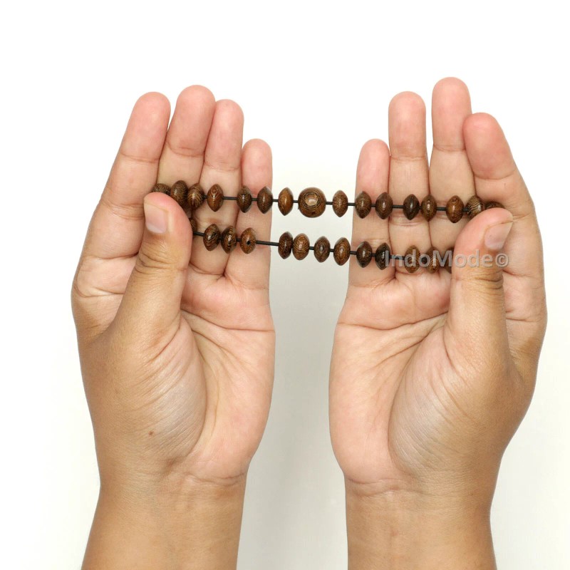 Natural Indonesian johar wood (cassia javanica) elastic string bracelet tasbih/prayer beads without dividers. These Prayer Bracelets are Made with 33 6mm rondelle-shaped beads and one 11mm round alif bead. Strung on virtually unbreakable dark brown 1mm thick elastic cord. Handcrafted in Indonesia, johar wood has a beautiful character because of the contrast between the grains of wood. The beads and string are water-resistant.