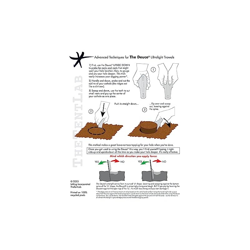 • You’ll use the Deuce upside down is about a third of the time: first to probe the top 3” for rocks or roots that might spoil your hole; this is a fantastic time-saving feature. Next, use it this way to saw the outline of the top of the hole. Deeper in the hole, use it the same way to break up hard dirt and pry out rocks. With The Deuce the workflow of making your poop-hole is one of continually changing grip as you saw, pry and scoop your way to a true 6” to 8” deep hole.