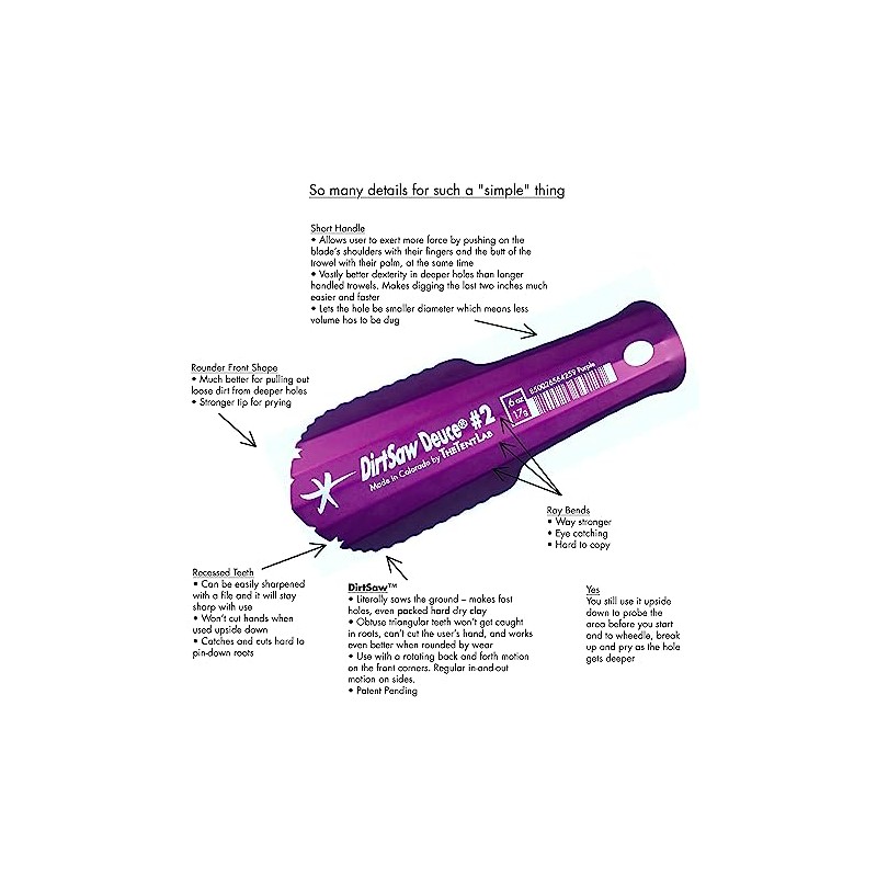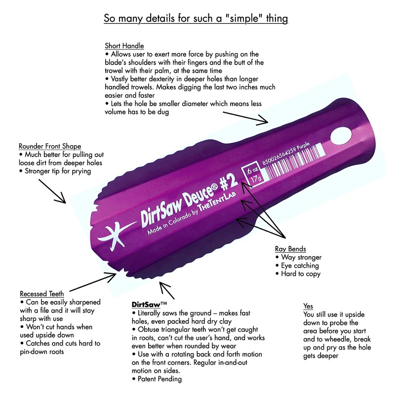 • The NEW Patent Pending DirtSaw Deuce urges you to rethink what a backpacking “Trowel” is and how to dig a hole. It agitates and cuts dirt like a serrated knife but doesn't snag on roots or threaten to cut your hand. Even better: DirtSaw teeth work best when they’re rounded with use.