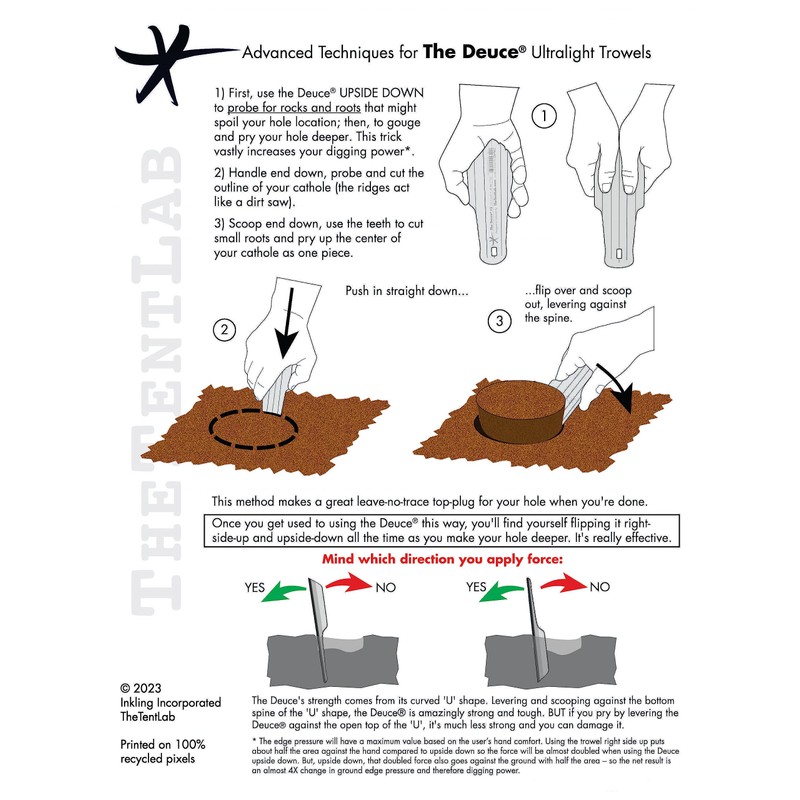 Backpackers, hikers, and campers take note: the legendary Deuce of Spades(TM) backpacker's poop-hole trowel blazes ahead again! Obviously, we think way too much about how to dig poop-holes faster, easier and more efficiently. The latest upgrade is a doozy; we call it the DirtSaw(R). It’s a total rethink of how to use a small hand tool to make a hole in the ground. It’s shockingly faster and easier to dig a poop-hole in some really tough soils.