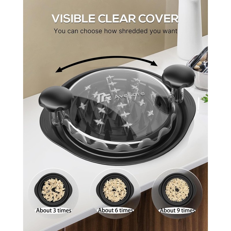 - HIGH QUALITY: Meticulously crafted with clear, large ergonomic handles, an anti-slip base, and a separete plate, our shredder ensures secure and hassle-free shredding. The BPA-free, heat-resistant design, dishwasher safe, guarantees safety and durability.