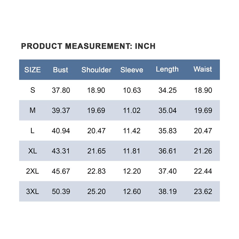 2XL:bust 46.46",shoulder 23.23",sleeve 13.39", length 37.8";