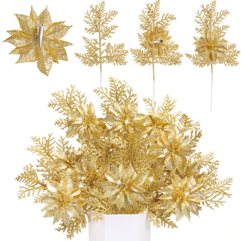 - Package Offers: we offer of 12 pcs gold Christmas glitter artificial poinsettia flowers picks and gold leaves sprays decor set, each with its own clip on the back, which does not require you to install it again; You can easily place it on Christmas trees, wreaths, tree toppers, wreaths, fireplaces, gift baskets, and more; When you attach it to a Christmas tree, it can blend perfectly with the Christmas tree as if it grew on the tree, Glitter faux flowers look exquisite and special