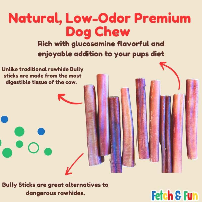 - High Protein Content: Fetch and Fun Bullysticks are rich in protein, supporting muscle development and overall health.