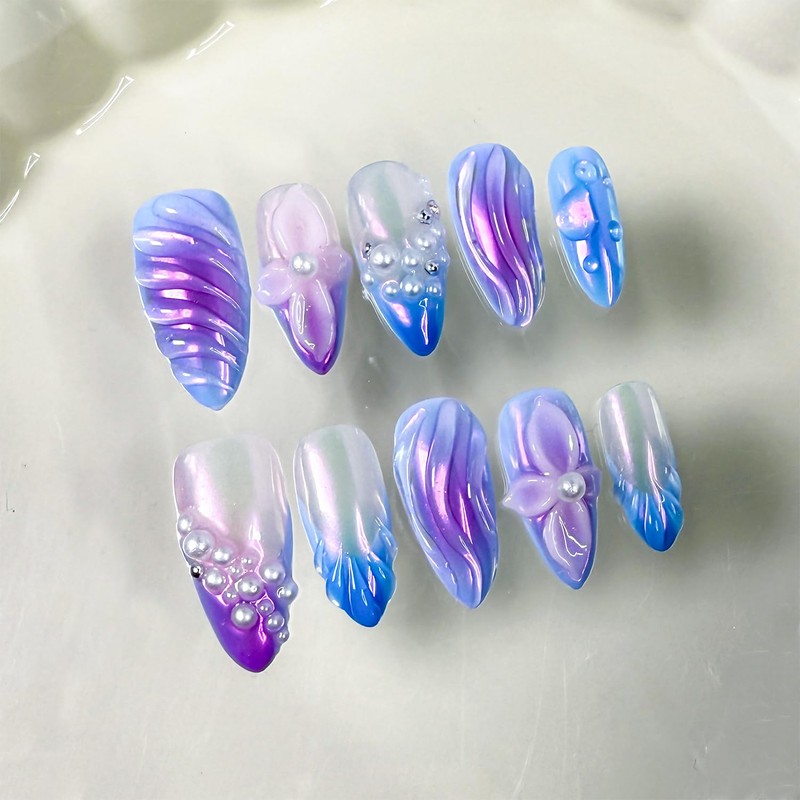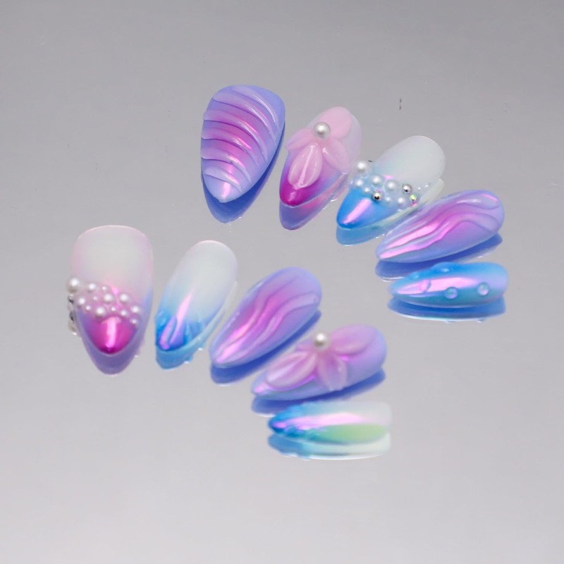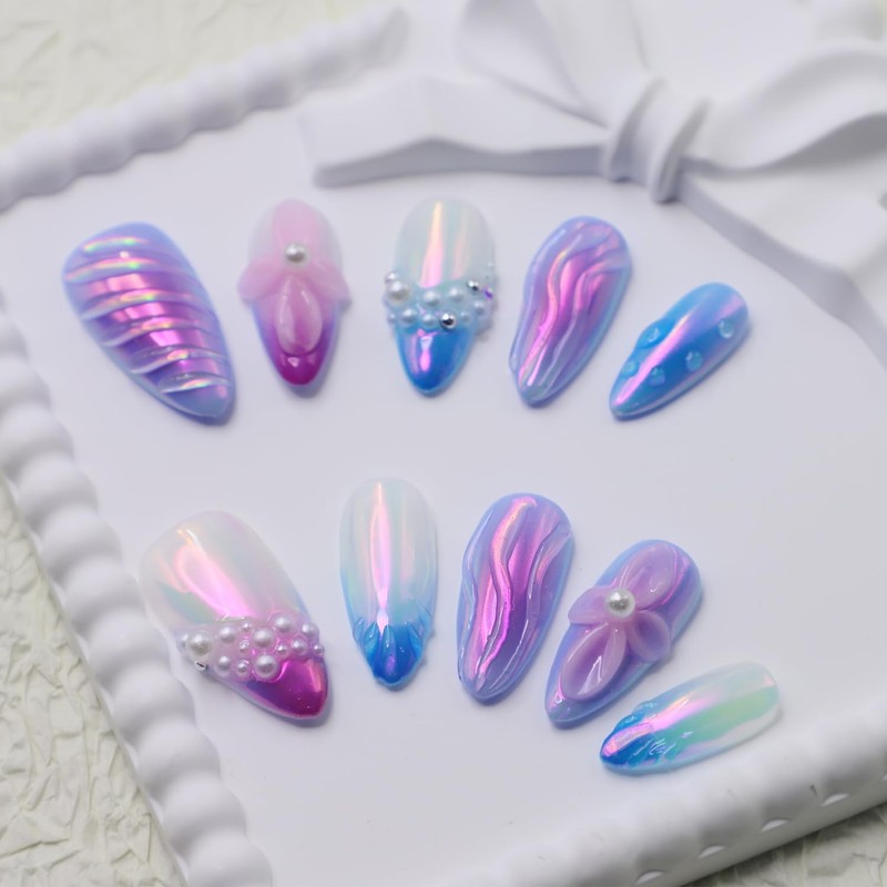 Thick Press on Nails Handmade Nails Medium Almond Nails Aurora Purple Fake Nails with 3D Flower Art Design Reusable Acrylic False Nails with Glue, Nature Stick on Nail for Wome (Size S)