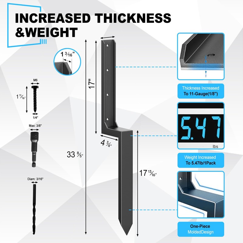 - 【Durable】33.62 inch fence post repair kit is crafted with heavy-duty metal, thickness reaches to 11-Gauge (1/8" x 2"). Deep Ground Length: 16.62 inches; Weight is 5.47lb for 1 Pack. It exhibits exceptional strength and durability. Our Fence Post Stakes are coated for rust resistance and designed to withstand yard, agricultural, and estate conditions. Providing strong anchoring for wood fence posts, garden, gate, and more.