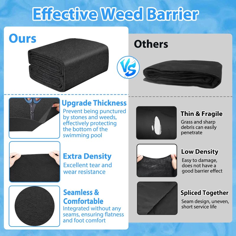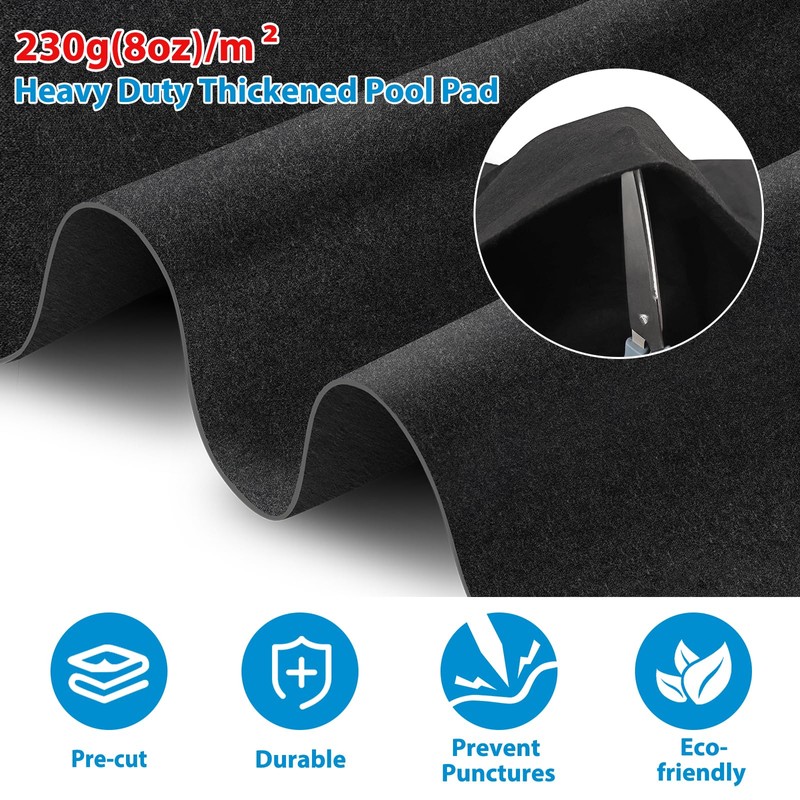 - Thickened Pool Pad: The pool pads for above ground pool are made of 8oz/m ² felt fabric, which is 40% thicker than other pool liner pad on the market. It is sturdy, durable, lightproof, and has strong puncture resistance. Provide a thick protective barrier for pool bottom to protect it from punctures and extend the lifespan of your ground swimming pool