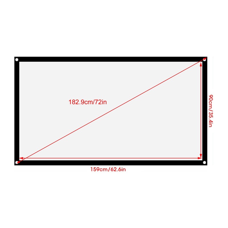 Optional Size: 40in, 60in, 72in, 84in, 100in, 120inSizeLength-width ratioViewable size(cm/in)Black edge width(cm/in)Hole quantityAccessoryHook(8 hooks and back gum)Hanging rope(2 pcs, 5m length)40in16:983x43/32.7x16.92.5/1.041160in16:9140x75/55.1x29.53/1.241172in16:9159x90/62.6x35.43/1.241184in16:9186x105/73.2x41.33/1.2611100in16:9221x125/87x49.23/1.2611120in16:9266x149/104.7x58.73/1.2811