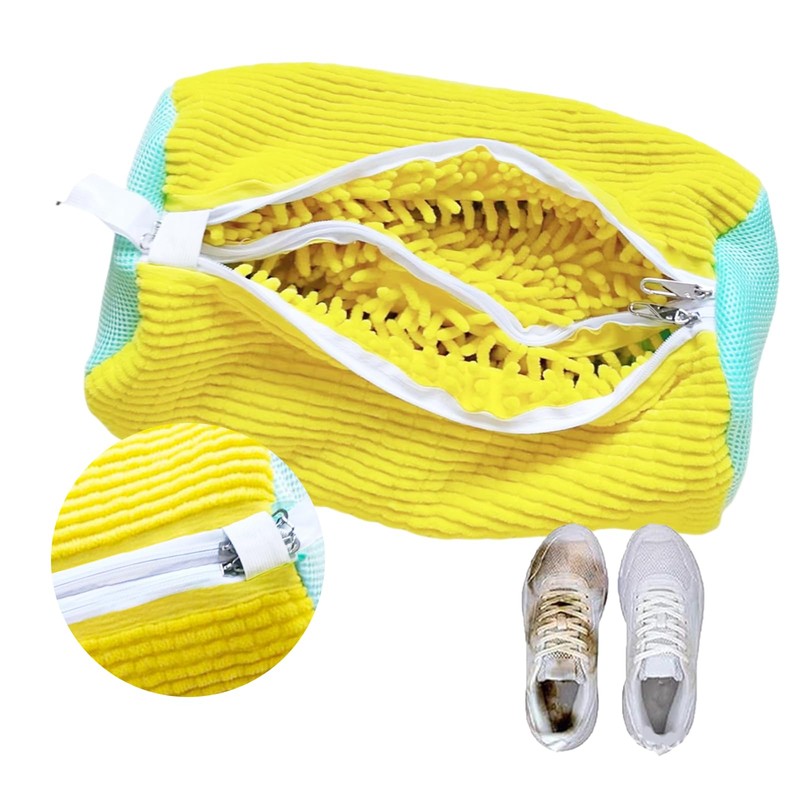 Thickened with Lock Function, Shoe Wash Bag Washing Machine 2-in-1 - Double Zip Shoe Bag Washing Machine with Chenille for 360° Cleaning, Reusable & Gentle (Yellow)