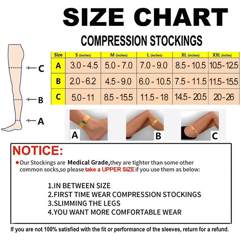 - NOTE - If conditions permit, we strongly recommend buying two pairs, alternately using them, which will double service life.(These stockings are tighter than some other common stockings, so please TAKE A UPPER SIZE if you use them as below: 1. in between size; 2.first time wear compression stockings; 3. slimming the legs; 4. you want more comfortable wear.)