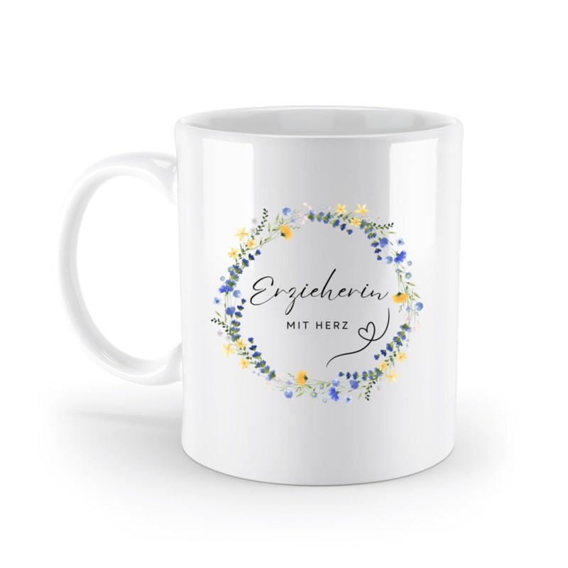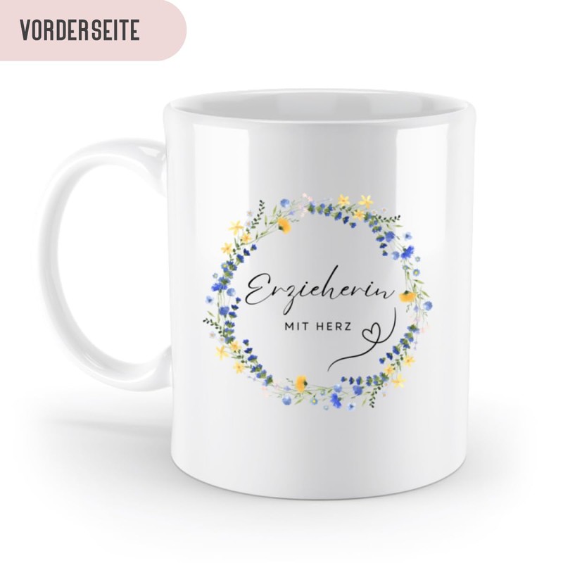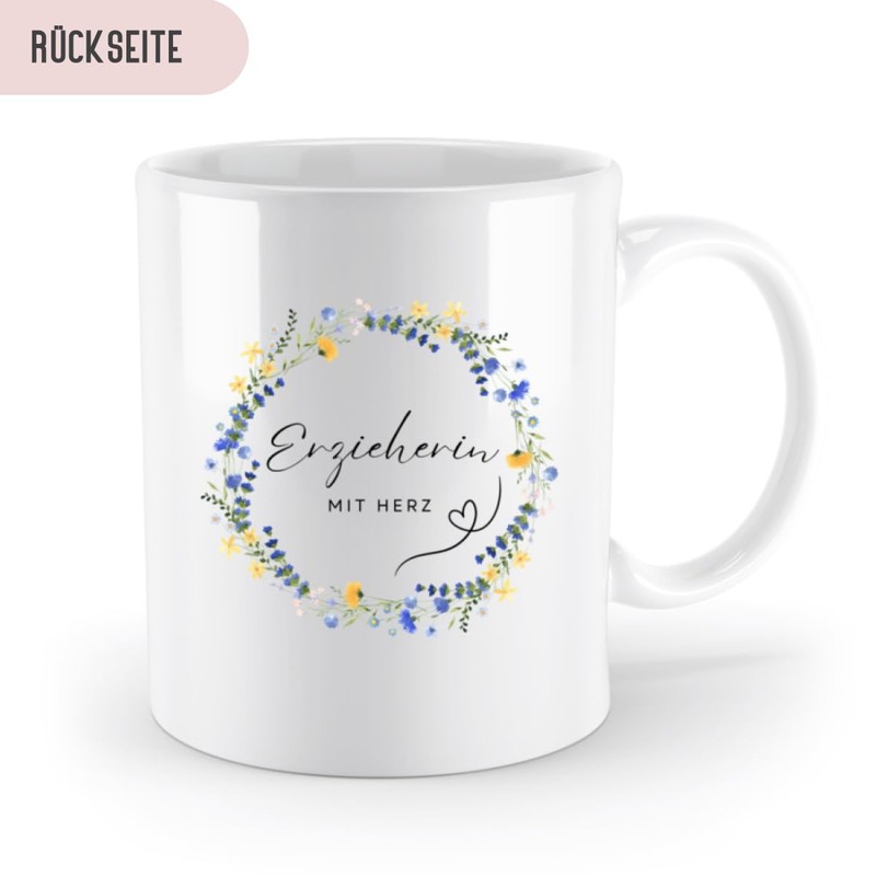 - 🌼 FÜR HERZENSERZIEHERINNEN » Liebevoll gestaltete Tasse mit floraler Kranz-Illustration und dem Spruch „Erzieherin mit Herz“ – ideal als Abschiedsgeschenk für Krippe, Kita & Kindergarten.
