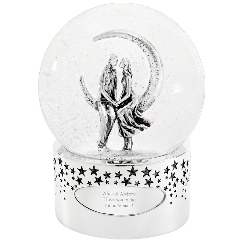 - KEY DETAILS – Silver moonlight couple snow globe with stars stamped around the base. Features a couple sitting on a crescent moon inside the globe. Clean with a soft cloth.