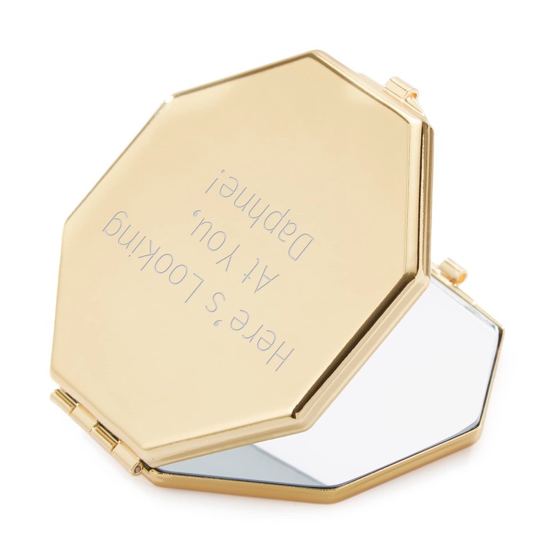 Easily touch up makeup no matter where or when with the Things Remembered Gold Octagon Compact Mirror. Perfect as a bridesmaid gift, Secret Santa gift, or a treat-yourself kind of gift, this modern gold-tone compact opens to reveal 2 mirrored sides: one mirror with 1x magnification and another with 2x magnification. The unique octagon shape is perfectly sized to slip into a purse, pocket, or makeup bag. Engrave the front and back of the compact with a name, monogram, or sweet personal message to take the gift to the next level.