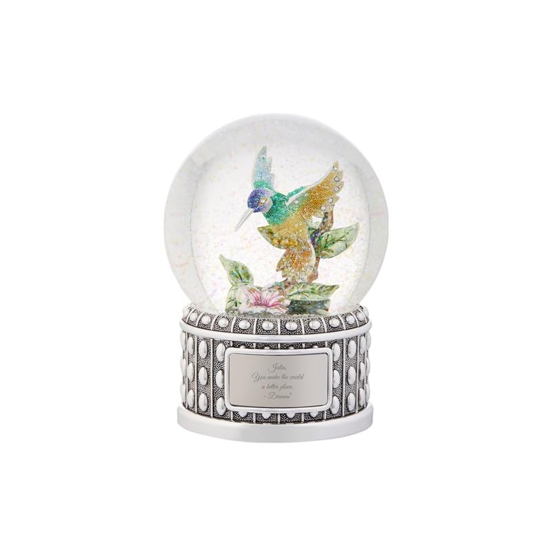 • SUPERIOR QUALITY AND DESIGN – This personalized musical snow globe freezes a beautiful multi-colored, jeweled hummingbird as it prepares to extract nectar from a blossom. The entire fascinating piece, including riveted base, is 6.5 inches high.