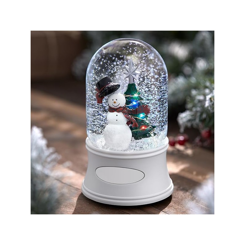 • KEY DETAILS – The snow globe features a festive scene of a smiling snowman lifting his black top hat along with a Christmas tree complete with lights that really work. The snowman is sporting red gloves and a red scarf and the tree is topped with a silver star. The globe sits atop a white base, making it the perfect addition to any holiday decor. Two (2)AA batteries are required and are not included.