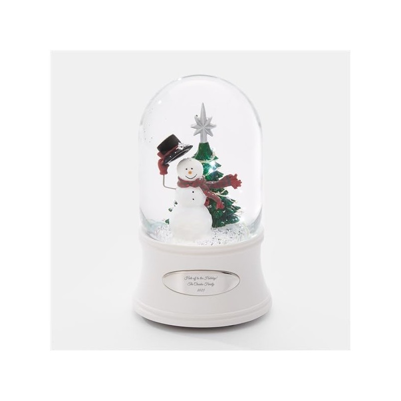 Spread joy and cheer this holiday season with the Things Remembered Snowman with Top Hat Light-Up Snow Globe. This festively fun snow globe includes a holiday scene of a joyful snowman lifting his top hat and a Christmas tree complete with lights that really light up. The globe sits atop a white base, the perfect canvas for your personalization to really shine. Engrave the front of the base with a family name, friendly greeting, or holiday lyric to complete the gift with a personal touch.