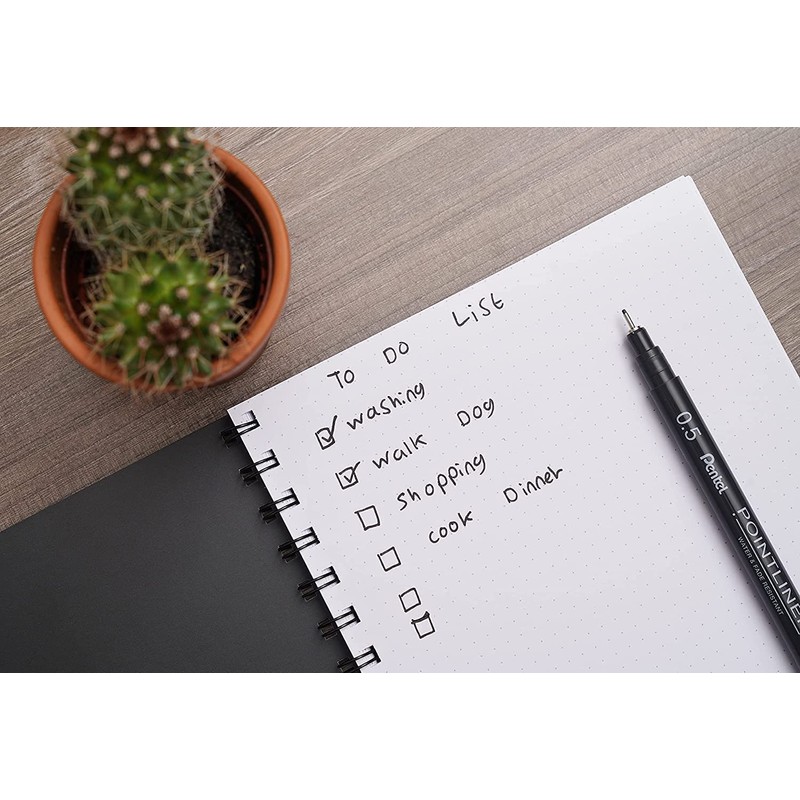 - Medium 6” x 8” spiral bound premium dot grid notebook with optimally spaced grey dots at 4.5mm (0.18in) and a heavy water resistant, anti-scuff 600gsm front and back cover.