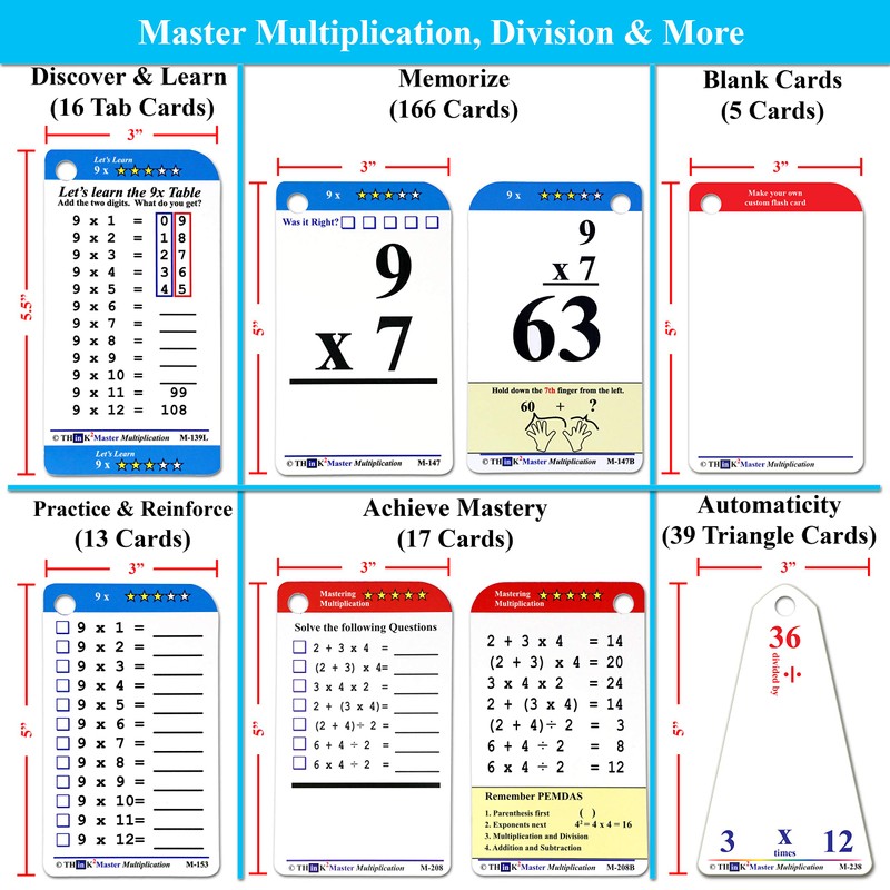 - 【LEARN MULTIPLICATION & DIVISION WITH 39 TRIANGLE CARDS】 – Once multiplication has been understood, attain automaticity of both multiplication and division by using the Triangle cards.   Simply cover up one number of the Triangle Card.   If the remaining two numbers are the same color (Blue), then multiply the remaining two numbers.   If the remaining two numbers are different colors (Red & Blue), then divide the blue number from the red number.