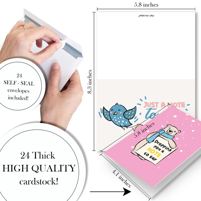 • 24 ENCOURAGEMENT CARDS WITH ENVELOPES With 24 thinking of you greeting cards, you’ll have more than enough to uplift those close to you. Each thinking of you card is 4.1”x5.8” in size (folded). Envelopes fit 4”x6” pictures