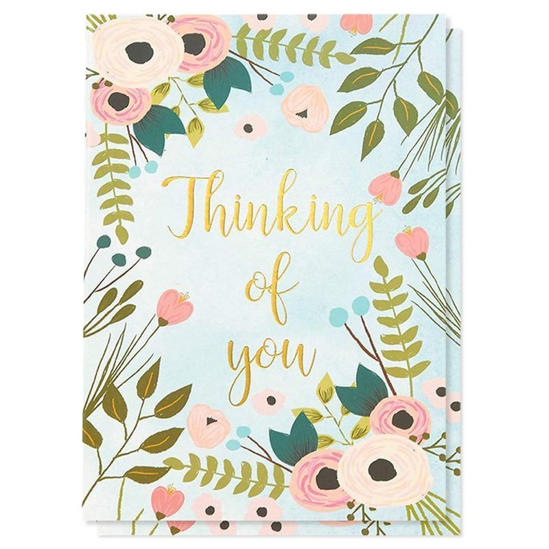 - Thinking of You Card Boxed Set: This 48 pack of Thinking of You greeting cards features an elegant floral design with gold foil text