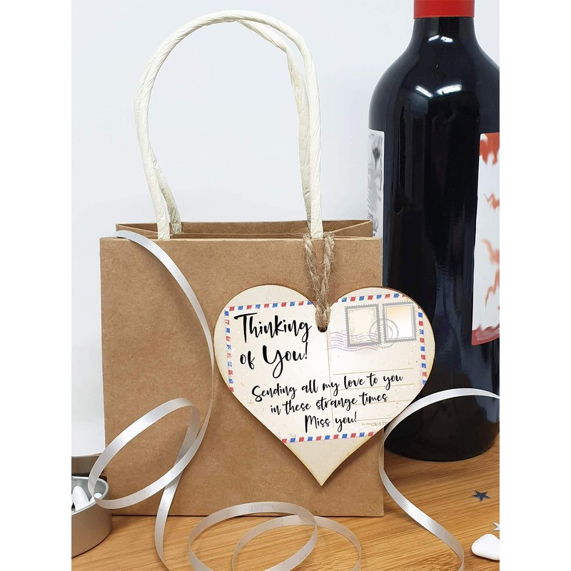 When someone you care about needs a gentle reminder that they’re not alone, this wooden heart plaque is a heartfelt way to say “I’m thinking of you.” Whether it’s for a friend going through a hard time, a loved one far away, or simply to brighten someone’s day, this charming keepsake delivers your message with warmth and simplicity. Made from high-quality 3mm Italian plywood, it features a rustic hanging twine and comes packaged with a printed backing card and transparent sleeve – ready to send or give. Its slim, letterbox-friendly design makes it ideal for popping in the post, bringing comfort no matter the distance. Wording on Plaque: Thinking of You! Sending all my love to you in these strange time. Miss You!
