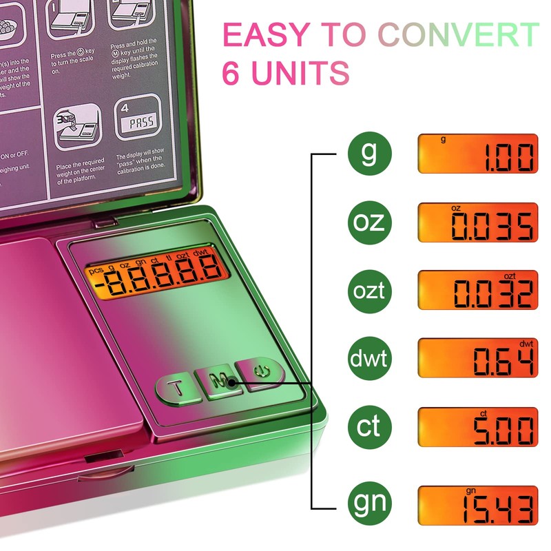 • Easy to Use: The gram scale does zero itself when you turn it on, and the tare function can quickly zero out any weight within 300g. "M" button with 6 different weights of measure that you can use from g, oz, ozt, dwt, ct, gn, it's very simple to change modes and easy to read with the back-lit.