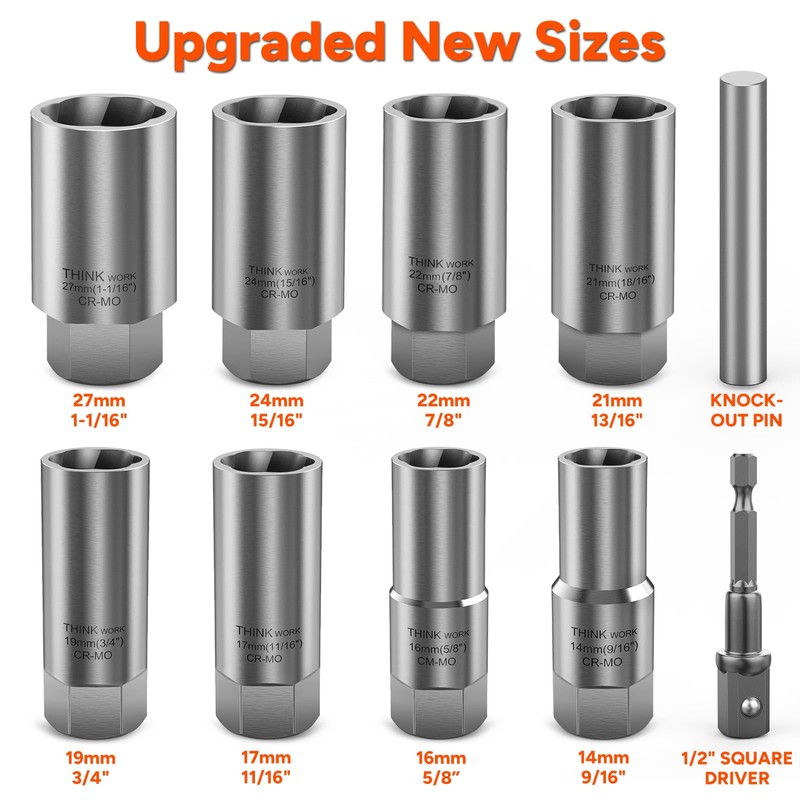 • Upgraded New Sizes: Compared to regular deep bolt extractor kits, our kit includes commonly used sizes (14mm, 16mm, 17mm, 19mm) plus larger options (21mm, 22mm, 24mm, 27mm) to meet a wider range of work needs
