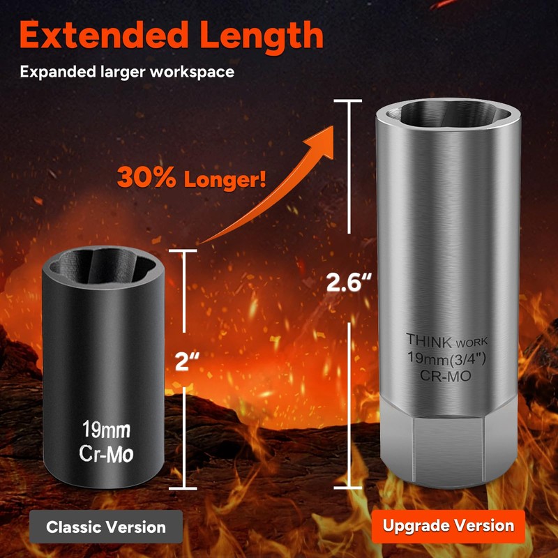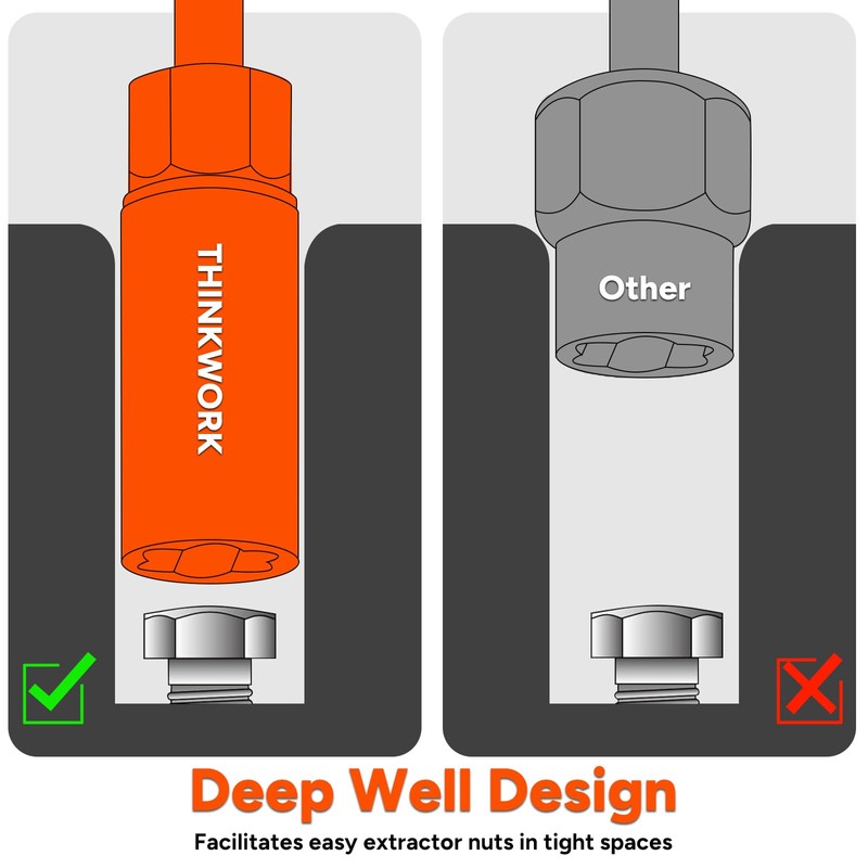 • Deep Well Design: Enables easy extractor nuts in tight spaces, addressing the limitations of other short extractors. The extended length provides more workspace than regular lug nut removers