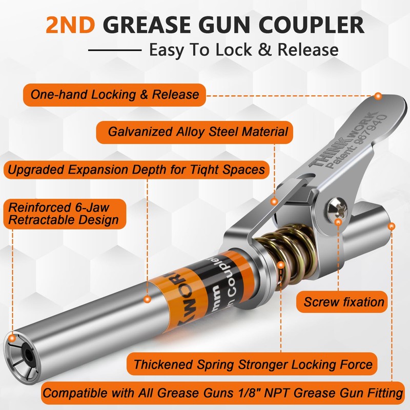 • Upgrade Locking & Sealing - With the exclusive patent in the United States, THINKWORK upgraded grease gun coupler adopts upgraded powerful patented 6-jaw structure. With reinforced jaws & high-quality aviation-grade sealing gaskets, Tested at 12000 PSI pressure also prevents leaks