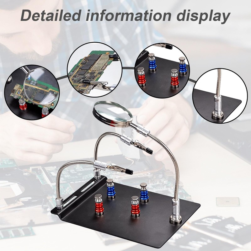 - Magnetic flexible arms: 3 adjustable metal gooseneck arms and 1 PCB holder with strong magnetic base have a strong attraction to the steel base. Third hand soldering is used to support the arm. Completely free your hands and work easier than ever. 3x magnified real glass lenses help you recognize details or small things, improve your work accuracy and efficiency and protect your eyes from fatigue.