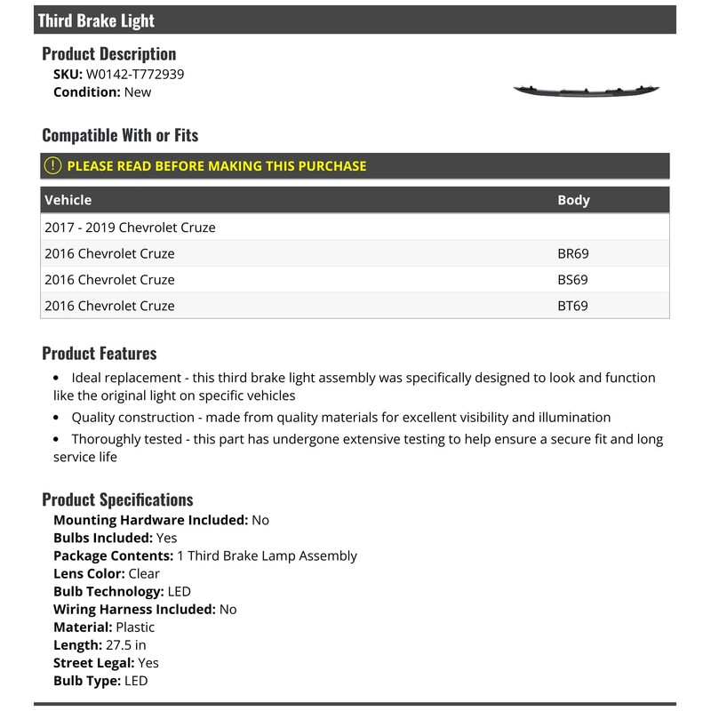 Third LED Brake Light - Compatible with 2016-2019 Chevy Cruze