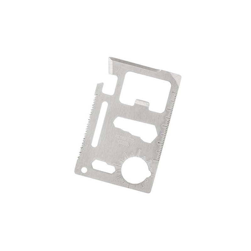 This 11 function tool is a life saver when you least expect it. Stainless steel construction and crammed with 11 tools into 1 credit card size that fits into any wallet. Includes a can opener, bottle opener, 4 and 2 position wrench, direction ancillary wrench, butterfly screw wrench, knife edge, saw blade, screwdriver, ruler and key ring hole. It's crafted from thick stainless steel that's strong enough for practical heavy usage. Each tool comes in a convenient fitted black leatherette pouch. Perfect for camping, backpacking, hiking, hunting, and travel. Makes a great gift that's also practical!